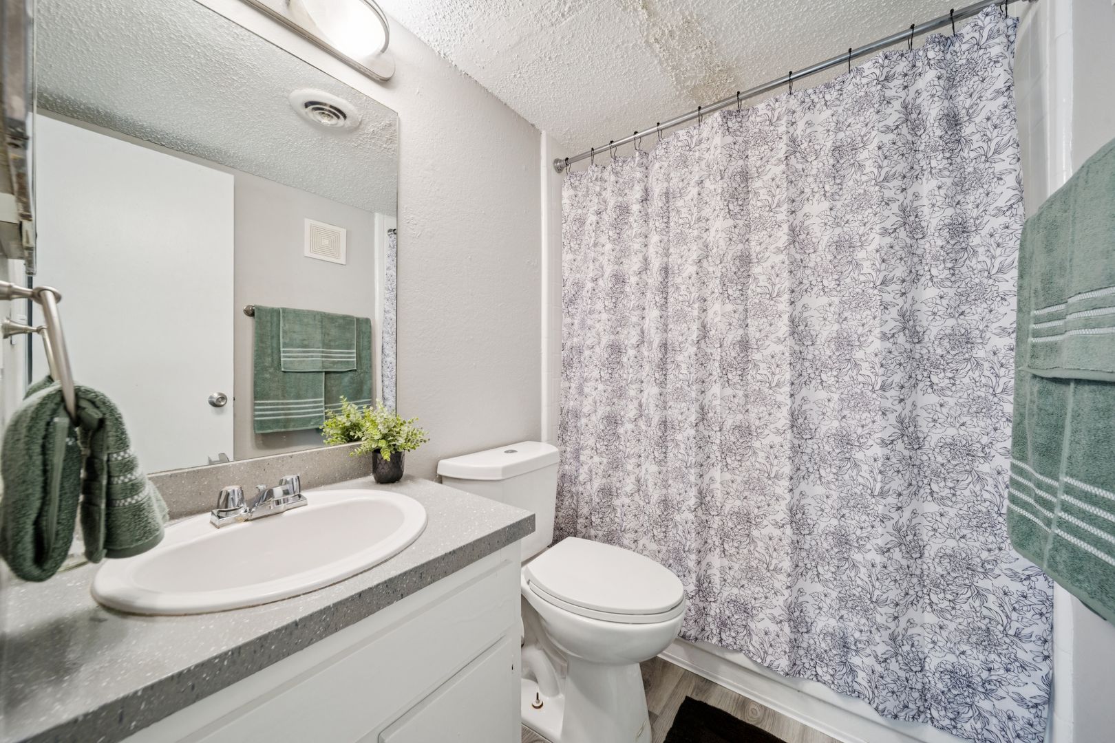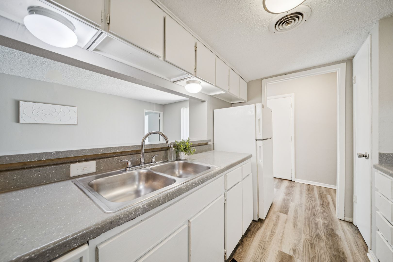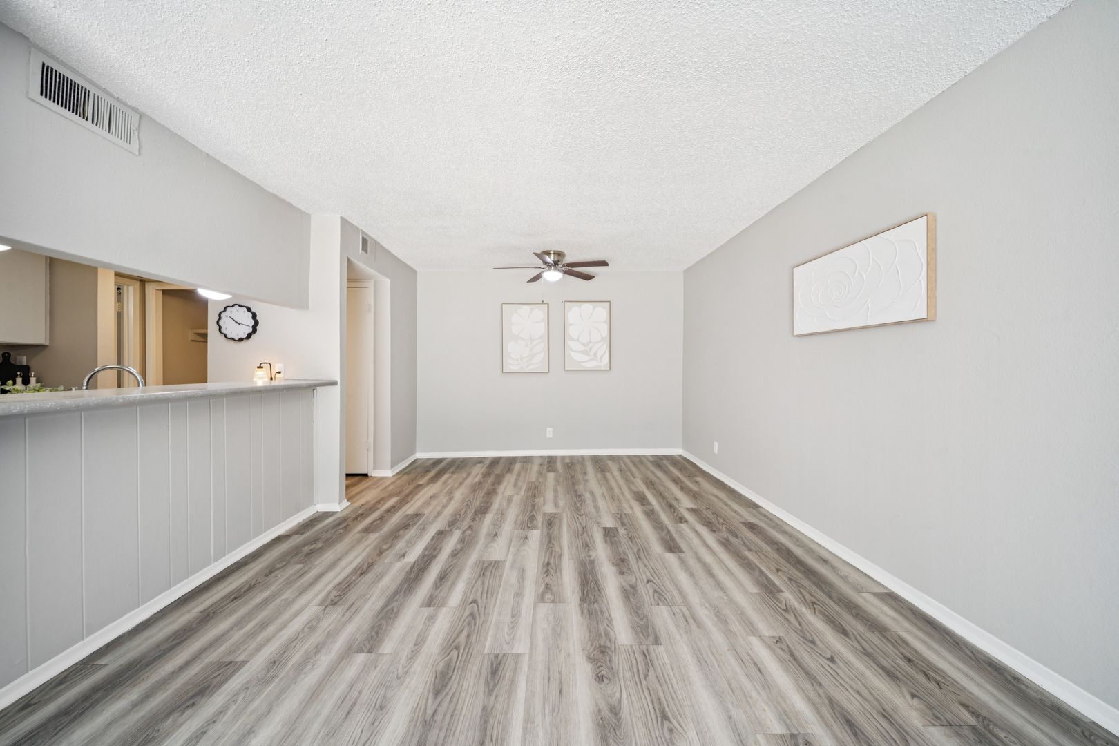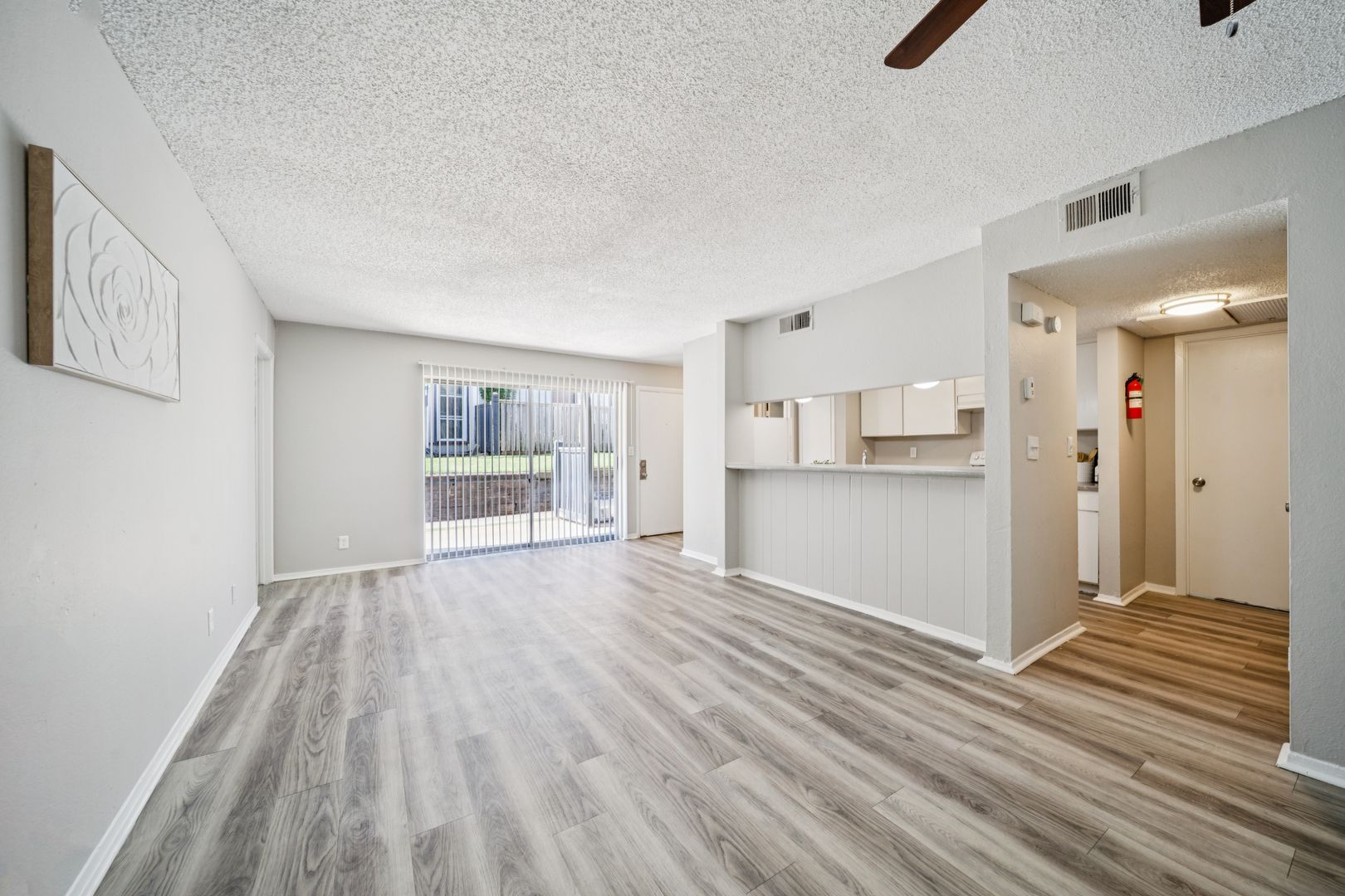 •Vinyl wood flooring in the kitchen, dining, and bathroom