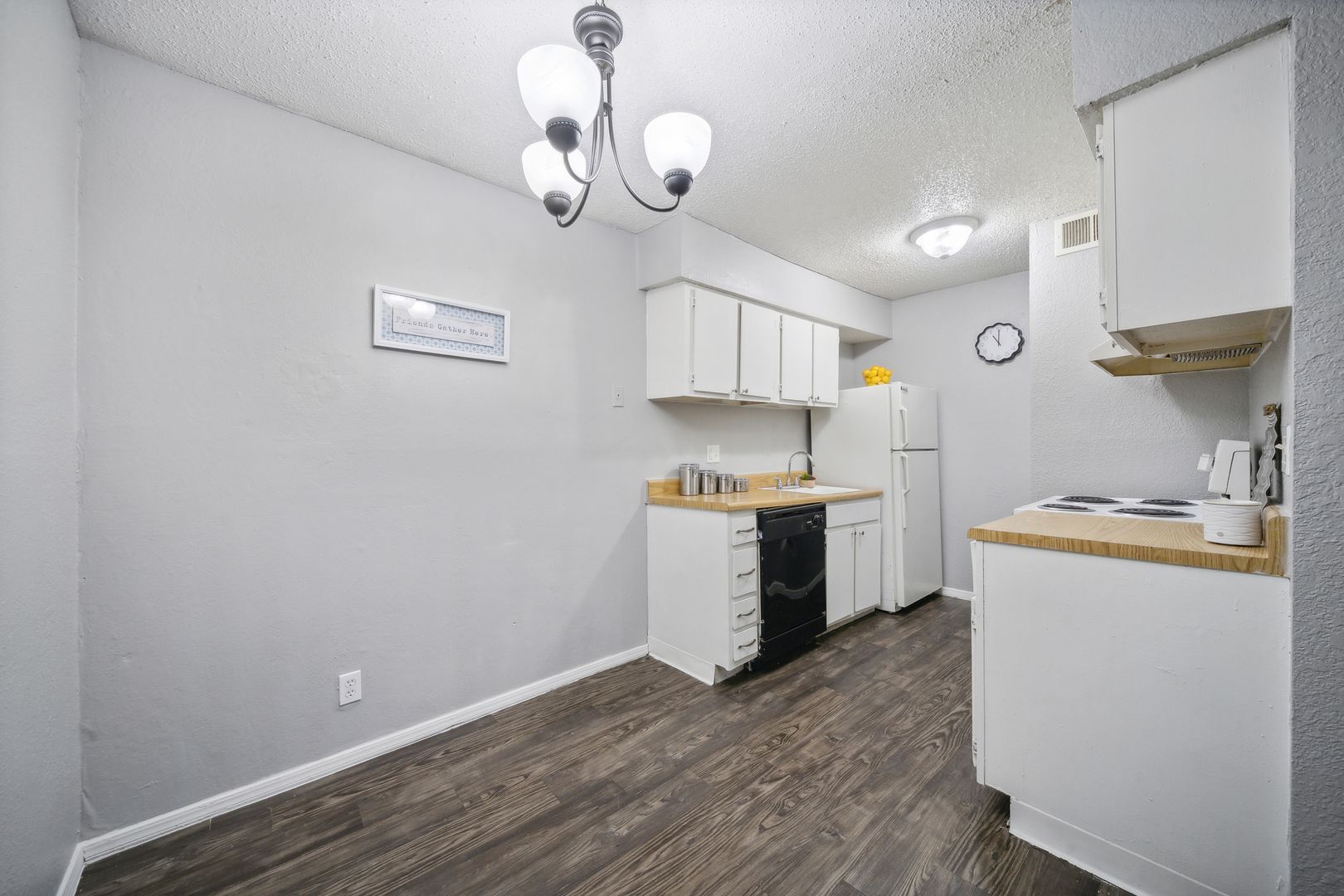 •Elegant vinyl wood flooring in the kitchen, dining, and bathroom